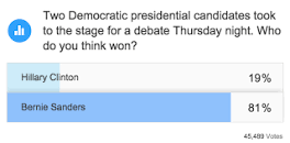 Bernie Sanders Sweeps Online Polls After Dominating Sixth Democratic Debate Who won the sixth Democratic debate? Hundreds of thousands of people voted online, and an overwhelming majority declared Bernie Sanders the ...
